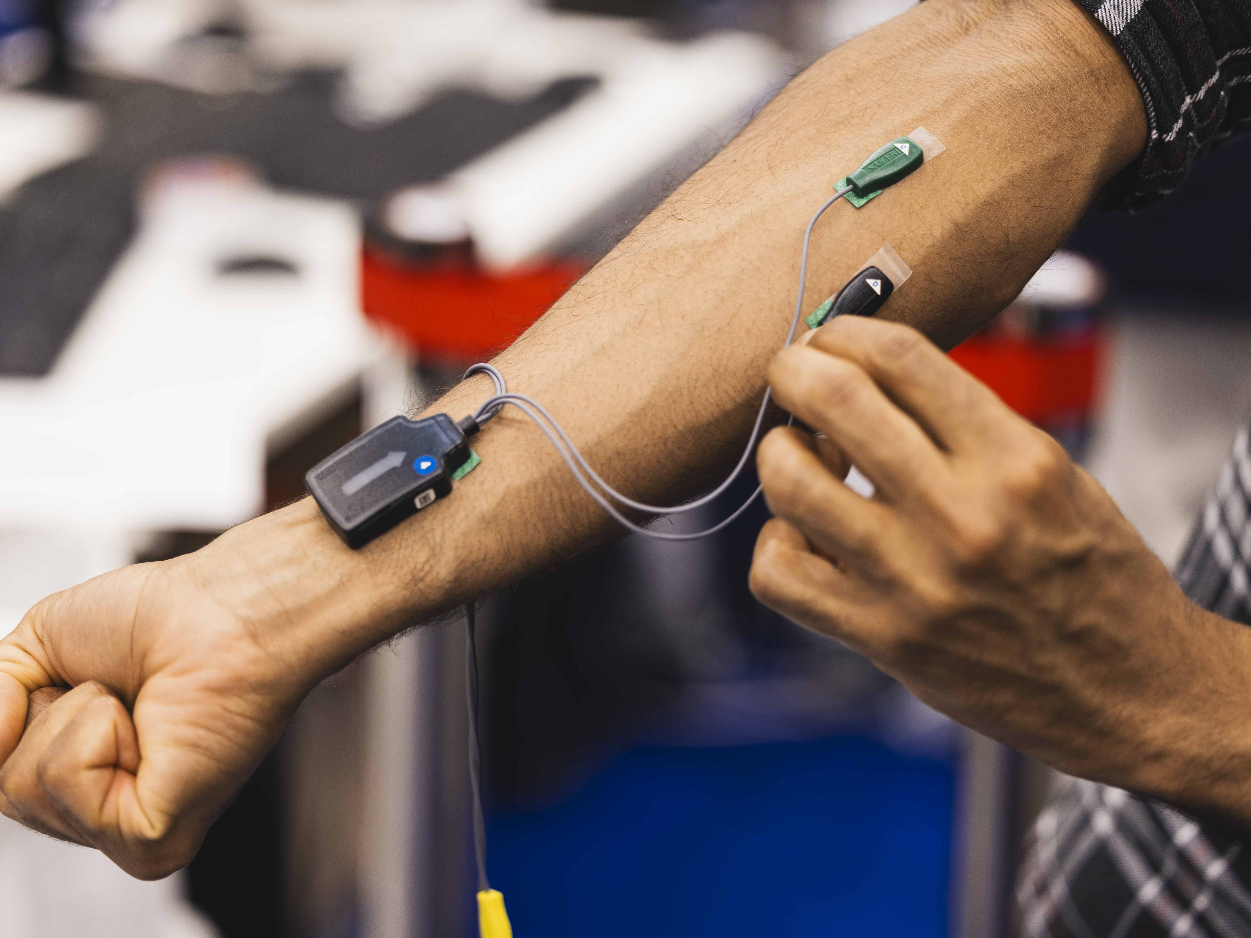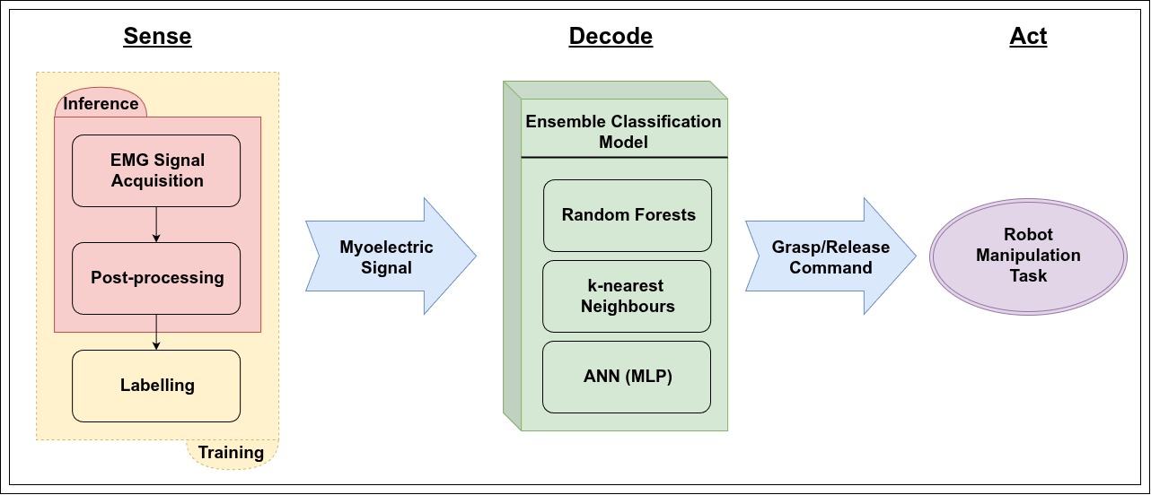 The myoelectric control in this project was enabled by a machine learning (ML) model that is trained to recognize specific patterns in electrical muscle activity. The model decodes a person’s forearm EMG signals into their intention to perform a particular hand motion from a discrete set of motions through classification-based pattern recognition: an established approach to myoelectric control. These intentions are in turn transformed into commands for a robotic/prosthetic hand to execute.